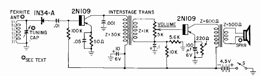 Na figura temos o diagrama de um simples rádio transistorizado para a faixa de ondas médias. O circuito foi encontrado na revista Radio Electronics de abril de 1960.
