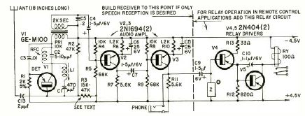 Publicado na Radio Electronics de janeiro de 1963 este circuito usa 5 transistores da época. A frequência de operação e de 27,355 MHz canal destinado a este tipo de aplicação na faixa dos 11 metros. O circuito se destina a um controle de abertura de porta de garagem.