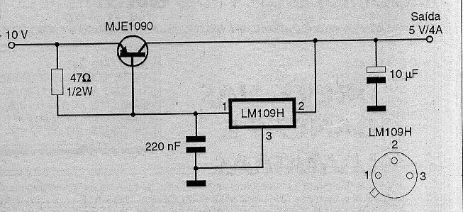 Com este regulador podemos ter correntes de até 4 ampères com 5V na saída. O transistor pode ser substituído por equivalentes Darlingtons de 10 A e deve ser montado num bom radiador de calor. O sufixo H indica que o LM109 tem invólucro metálico com pinagem mostrada junto ao diagrama.