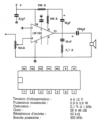 O circuito tradicional foi retirado de uma revista francesa Radio Plans que não mais existe, mas pode ser ainda montado pois o CI ainda pode ser encontrado, se bem que com alguma dificuldade. A potência depende da tensão de alimentação e da carga.