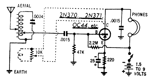 Encontrado numa publicação inglesa dos anos 70, este rádio usa transistor de germânio e exige fone de alta impedância, pelo menos 2k.