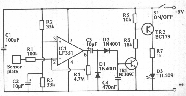 Este sensor de proximidade foi encontrado numa documentação antiga. Os transistores podem ser os BC548 ou BC558 para o PNP e o amplificador operacional admite equivalente.