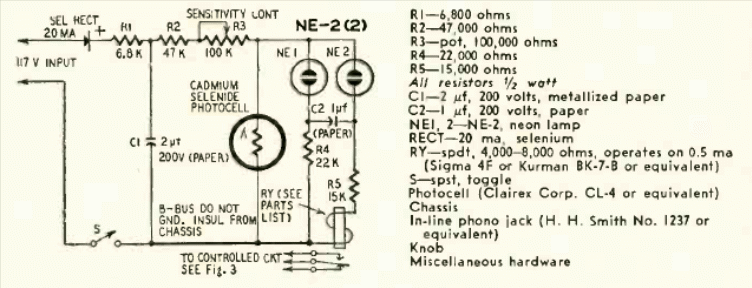 Este flip-flop controlado por uma fotocélula tipo LDR foi encontrado na revista Radio Electroinics de junho de 1959. Observe que ele pode ser alimentado pela rede e controla diretamente um relé sensível.