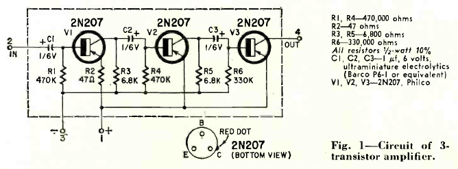 Este amplificador com acoplamento direto usando 3 transistores e alimentação de baixa tensão foi encontrado na revista Radio Electronics de abril de 1961.