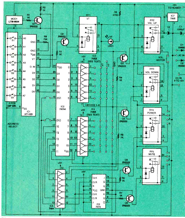 Este é o circuito receptor para o transmissor anterior. O circuito tem uma chave de programação para decodificar os sinais. Esta chave deve ter o código do transmissor.