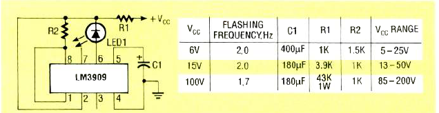 Utilizando o LM3909 este circuito foi encontrado na revista Radio Electronics de janeiro de 1992. O resistor R1 deve ser escolhido de acordo com a tabela dada ao lado do diagrama.