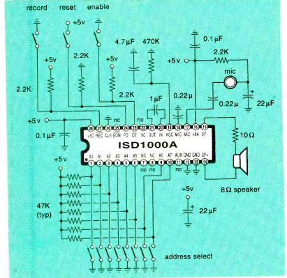 O circuito mostrado foi encontrado na revista Electronics Now de fevereiro de 1994. O circuito grava mensagens de alguns segundos e as reproduz conforme seleção de chaves.