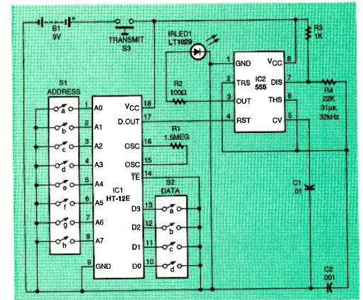 Este circuito de 4 canais antigo foi encontrado na revista Electronics Now de dezembro de 1994. O circuito usa como modulado0r um 556. Obsrve a chave de programação do código.