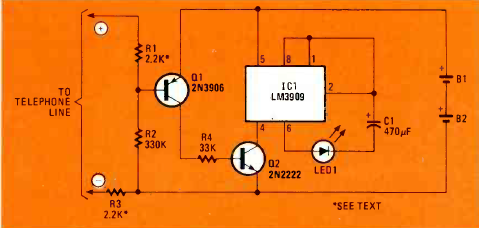 Este circuito para telefones analógicos comuns foi encontrado na revista Radio Electronics de março de 1982. Ele se aplica a linhas que tenham uma extensão (segundo telefone).