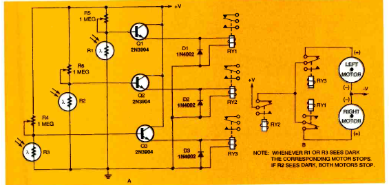 Encontramos este circuito na revista Electronics Now de outubro de 1996. O circuito usa LDRs como sensores e aciona relés. Os relés devem ter tensões de acordo com a alimentação.