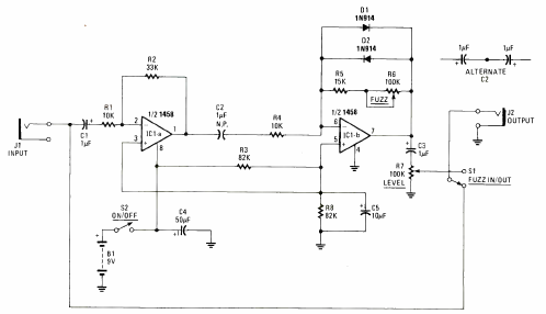 Este circuito com operacionais comuns foi encontrado na edição de 1993 do Radio Electronics Special Projects. O circuito é intercalado entre o captador e a entrada do amplificador.