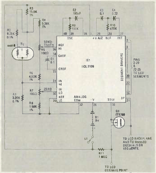 Encontrado na revista Radio Electronics de março de 1985 este circuito utiliza um módulo digital da época que facilita sua configuração. O circuito usa um termistor em ponte como sensor.