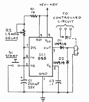 Esta é uma das configurações possíveis de timer com o 555. Encontramos na revista Radio Electronics de outubro de 1986. Ela aciona diretamente um relé. O tempo é dado por C1.