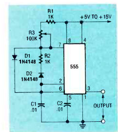 Encontramos este circuito na revista Radio Electronics de outubro de 1992. O ciclo ativo pode ir de 0 a 99%. A frequência é dada por C1.