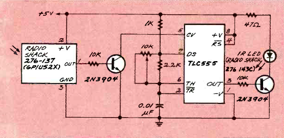 Baseado no 276-137 da Radio Shack, este circuito foi encontrado na revista Electronics Now de dezembro de 1995. O circuito aciona um LED, mas pode ter em seu lugar um relé.