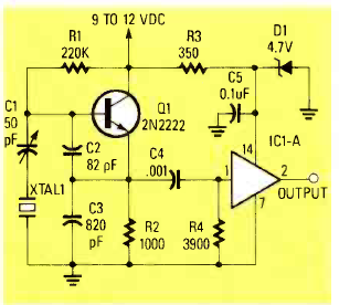 Encontramos este circuito na revista Radio Electronics de janeiro de 1986. A frequência é dada pelo cristal e qualquer porta TTL serve devendo ser alimentado com 5 V.