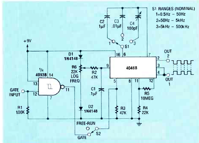 Usando um PLL 4046 este circuito gera sinais retangulares em três faixas de onda que dependem dos capacitores utilizados. O circuito é de uma Radio Electronics de dezembro de 1989.
