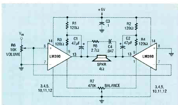 Este circuito fornece uma potência de 2,5 W com alimentação de 6 V e alto-falante de 4 ohms. Encontramos na revista Radio Electronics de abril de 1990.