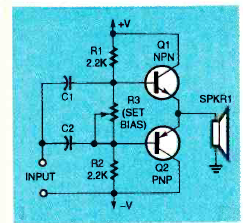 Este pequeno amplificador de dois transistores foi encontrado na revista Electronics Now de abril de 1994. Esta etapa é alimentada por fonte simétrica.