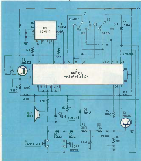 Usando um circuito integrado dedicado, este circuito foi encontrado na revista Radio Eklectronics de janeiro de 1984. As melodias vêm previamente programadas no circuito integrado.