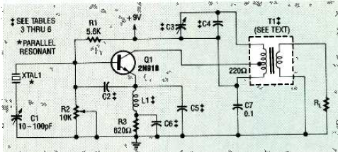 Este circuito foi encontrado na revista Radio Electronics de fevereiro de 1993. A frequência depende do cristal e R2 ajusta o ponto ideal de oscilação.