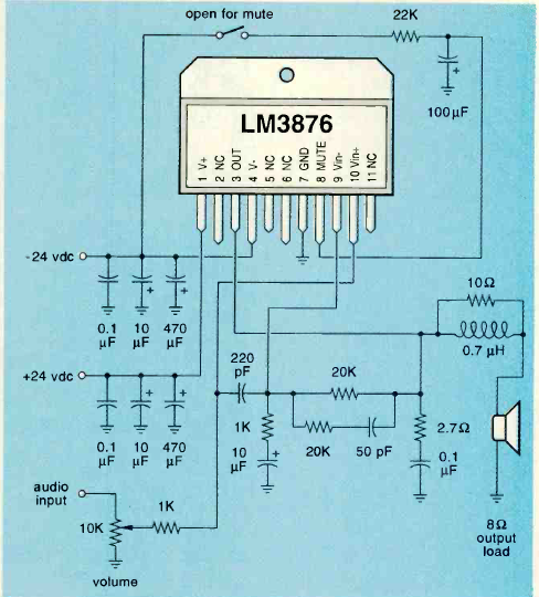 Este amplificador de áudio híbrido da National Semiconductor foi encontrado na revista Electronics Now de junho de 1994. A alimentação é de 24 V