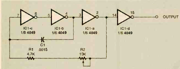 Este circuito foi encontrado na revista Electronis Now de julho de 1998. Trata-se de uma versão tradicional com portas do 4049 e tem a frequência controlada em R2.