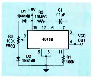 Este VCO com o PLL 4046 gera sinais de 0 a 1,5 kHz. O circuito é de uma Radio Electronics de dezembro de 1989. O capacitor C1 pode ser alterado para outras faixas de frequência.