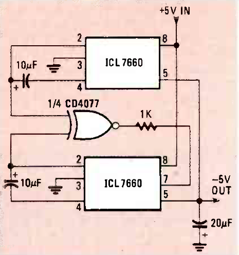 Com este circuito é possível obter uma tensão de -5 V a partir de uma fonte de 5 V. O circuito é de uma Radio Electronics de maio de 1982. A corrente máxima é da ordem de 80 mA.