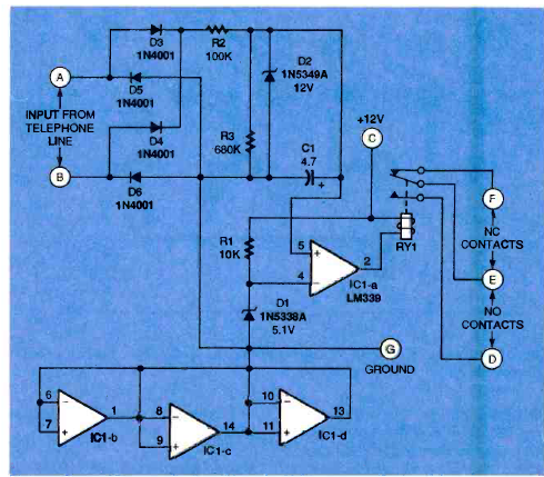 Este circuito para linhas telefônicas antigas foi encontrado na revista Electronics Now de março de 1997. O circuito aciona um relé conforme a tensão monitorada na linha.