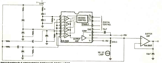 Este circuito foi encontrado na revista Radio Electronics de março de 1980. Ele se baseia no CI HA2400 que deve ser alimentado por fonte simétrica. A frequência máxima é de 10 MHz dependendo dos componentes da rede externa.