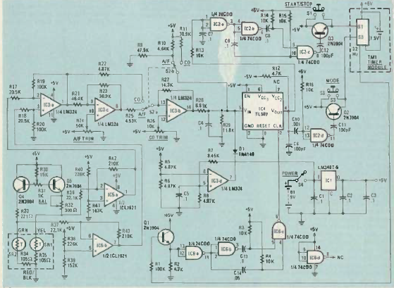 Este circuito foi encontrado na revista Radio Electronics de maio de 1984. Ele faz a análise dos gases emitidos pelo escapamento de um carro. O circuito usa um sensor de gás especial da época.