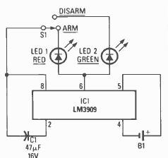 Os LEDs piscando neste circuito simulam um alarme em funcionamento podendo servir como desestimulador para um eventual ataque. O circuito é da Radio Electronics de agosto de 1986.