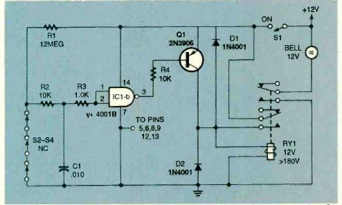 Este circuito de alarme com sensores em série foi encontrado na revista Electronics Now de junho de 1994. O circuito tem a alimentação de acordo com o relé empregado.