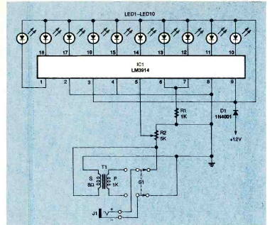 Usando o LM3914, este circuito serve para experimentos de bancada. Foi encontrado na revista Electronics Now de março de 1995. Observe a tensão de alimentação.