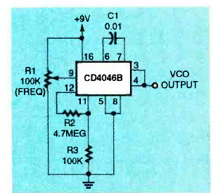 Este VCO com o CMS 4046 foi encontrado na revista Electronics Now de agosto de 1994. A frequência é dada basicamente por C1, podendo ser alterado.