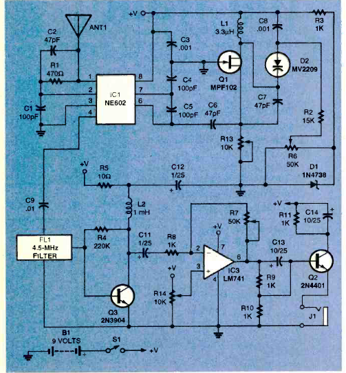 Descrito num artigo da revista Electronics Now, este receptor é montado com componentes SMD. O circuito tem as frequências determinadas pela bobina L1.