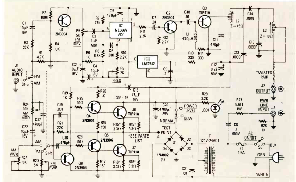 Este circuito foi encontrado na revista Radio Electronics de janeiro de 1989. O circuito envia sinais de áudio modulando uma portadora de baixa frequência através da rede de energia.