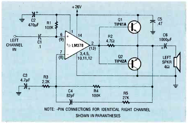 Este circuito fornece 15W por canal podendo funcionar com fonte simples. O circuito é de uma Radio Electronics de abril de 1990.