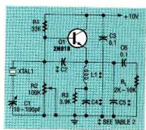 Este oscilador a cristal utiliza um transistor comum e sua frequência depende do cristal utilizado. Encontramos na revista Radio Electronics de fevereiro de 1993.