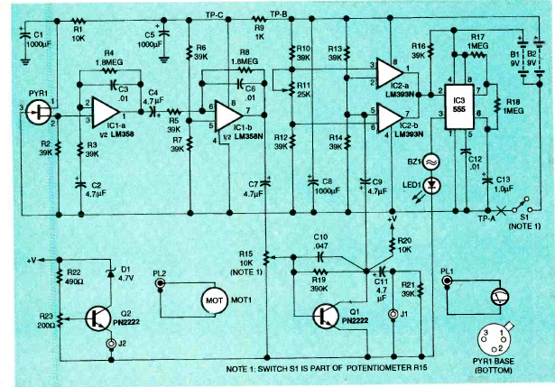 Usando um sensor pieroelétrico da época, este circuito foi encontrado na revista Radio Electronics de fevereiro de 1994. O circuito se baseia em componentes ainda comuns, exceto o sensor.