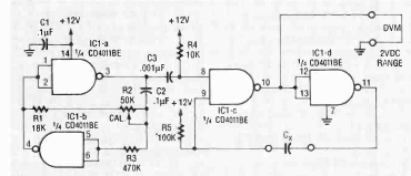 Encontrado num Electronics Experimenter Handbook de 1993, este circuito usa um multímetro para medir capacitâncias. O circuito é alimentado por 12 V.