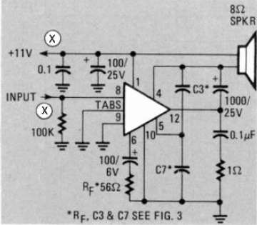 Este pequeno amplificador de áudio de alguns watts encontrado em saída de televisores foi publicado na revista Radio Electronics de novembro de 1980. O circuito deve ser alimentado com tensão de 11 V.