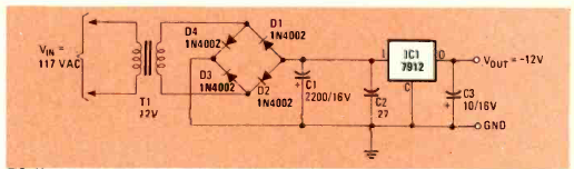 Esta fonte usa um transformador com enrolamento simples. Encontramos na revista Radio Electronics de julho de 1984. O circuito integrado deve ser dotado de dissipador de calor.