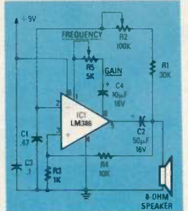 Circuitos como este, aproveitando o amplificador de áudio LM386 estão disponíveis de outras fontes nesta mesma seção. Este é da revista Radio Electronics de agosto de 1986.