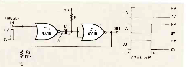 Esta configuração com duas portas do 4001 foi encontrada na revista Radio Electronics de abril de 1988. Os tempos são dados por R1 e C1 em função do comportamento desejado para o circuito.