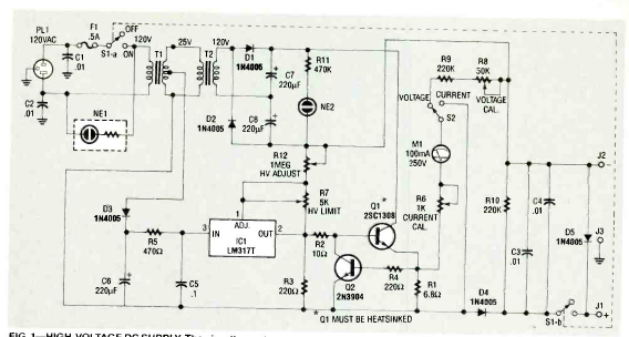Este circuito de fonte de alimentação foi obtido na revista Radio Electronics de fevereiro de 1993. O circuito integrado e os transistores de potência devem ser dotados de radiadores.
