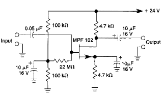 Esta etapa amplificadora com JFET foi encontrada na Enciclopédia de Circuitos Eletrônicos Volume 5 de 1995. Qualquer JFET pode ser usado e a polarização controlada externamente.