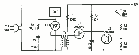 Encontramos este circuito na revista Radio Electronics de outubro de 1987. O circuito usa um transformador de pulso com relação de espiras de 1 para 1 no disparo do Triac.