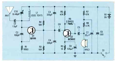 Este pequeno transmissor saiu na revista Radio Electronics de março de 1989. Circuito de dois transistores usava um microfone de eletreto e tinha alcance de algumas dezenas de metros.